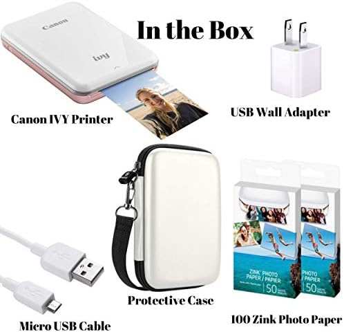 Kit Includes: Canon IVY Mini Photo Printer, 100 sheets of 2×3-inch Zink Photo Paper, Protective Case, USB Charging Cable and USB Wall Adapter.