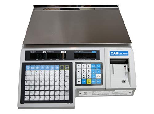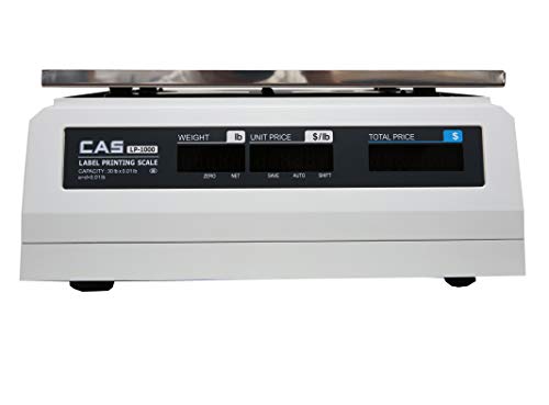 The CAS LP1000N label-printing scale is for use in supermarkets, specialty stores, and delicatessens, and is legal for trade. It has 54 speed keys for direct data entry and data transfer capability between the scale and PC in both directions. It has scale-to-scale PLU (price lookup code) data transfer capability. It can store 4,000 PLU codes of eight lines/50 characters each. It measures 7.8 x 16.1 x 16.9 inches (H x W x D). ). (H is the vertical distance from lowest to highest point, W is width, the horizontal distance from left to right; D is depth, the horizontal distance from front to back.) It runs on AC 120V, 60 Hz power.