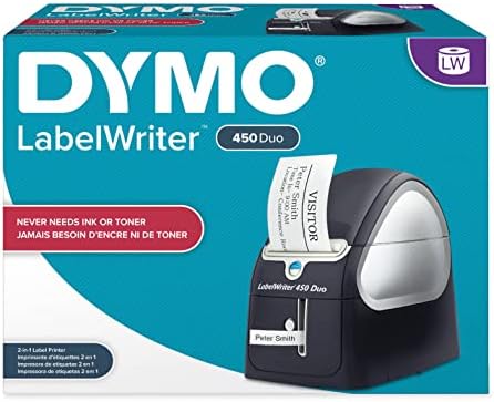 Our most versatile label printer, the DYMO LabelWriter 450 Duo prints LW labels, plastic D1 labels and durable IND labels so that you can take on virtually any labelling job. Print address labels or name tags using LW labels, then easily switch over to D1 labels for filing needs. Connect the Duo label maker to your PC or Mac and you can print directly from a wide variety of popular programs or create customized labels using DYMO Label software. Now you can tackle virtually any task with one versatile label printer.