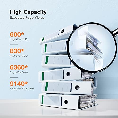 Page Yield: PGBK (Large Black) is 600 pages per cartridge, Small Black is 6360 pages per cartridge, Photo Blue is 9140 Pages per cartridge, Color is 830 pages per cartridge