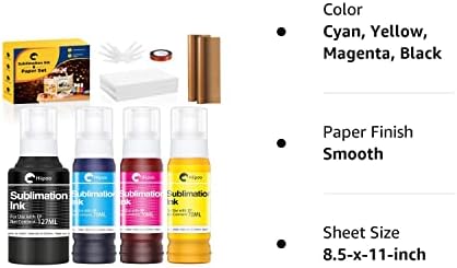 Included Items: 1x127ml black sublimation ink; 1x70ml cyan sublimation ink; 1x70ml magenta sublimation ink; 1x70ml yellow sublimation ink; 110 x sublimation paper(8.5*11” 125G); 2 x teflon sheets; 1x sublimation heat tape; 2 x gloves. This package makes it simple and easy to refill, making it wonderfully user & eco-friendly. This is a product that you will come to love as soon as you receive it.
