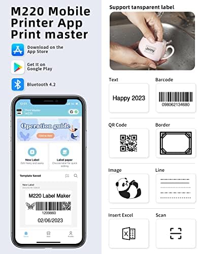 Small & portable Label printer – Phomemo m220 thermal label maker printer size: 6.2*5.7*3.4 inch, weight 400g, built in 2200mAh rechargeable battery, printing 36 rolls labels at least continuously.Enjoy the mini bluetooth label printer bring efficiency and funny.